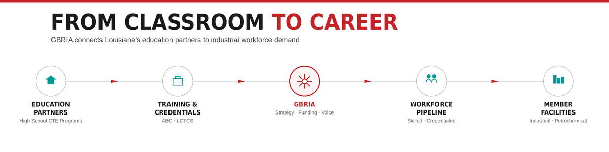 - LCTCS: GBRIA partners with community college leadership to align Craft and Process Technology programs with employer demand, supporting recruitment efforts and competitive grants to ensure graduates are prepared for industrial operations.